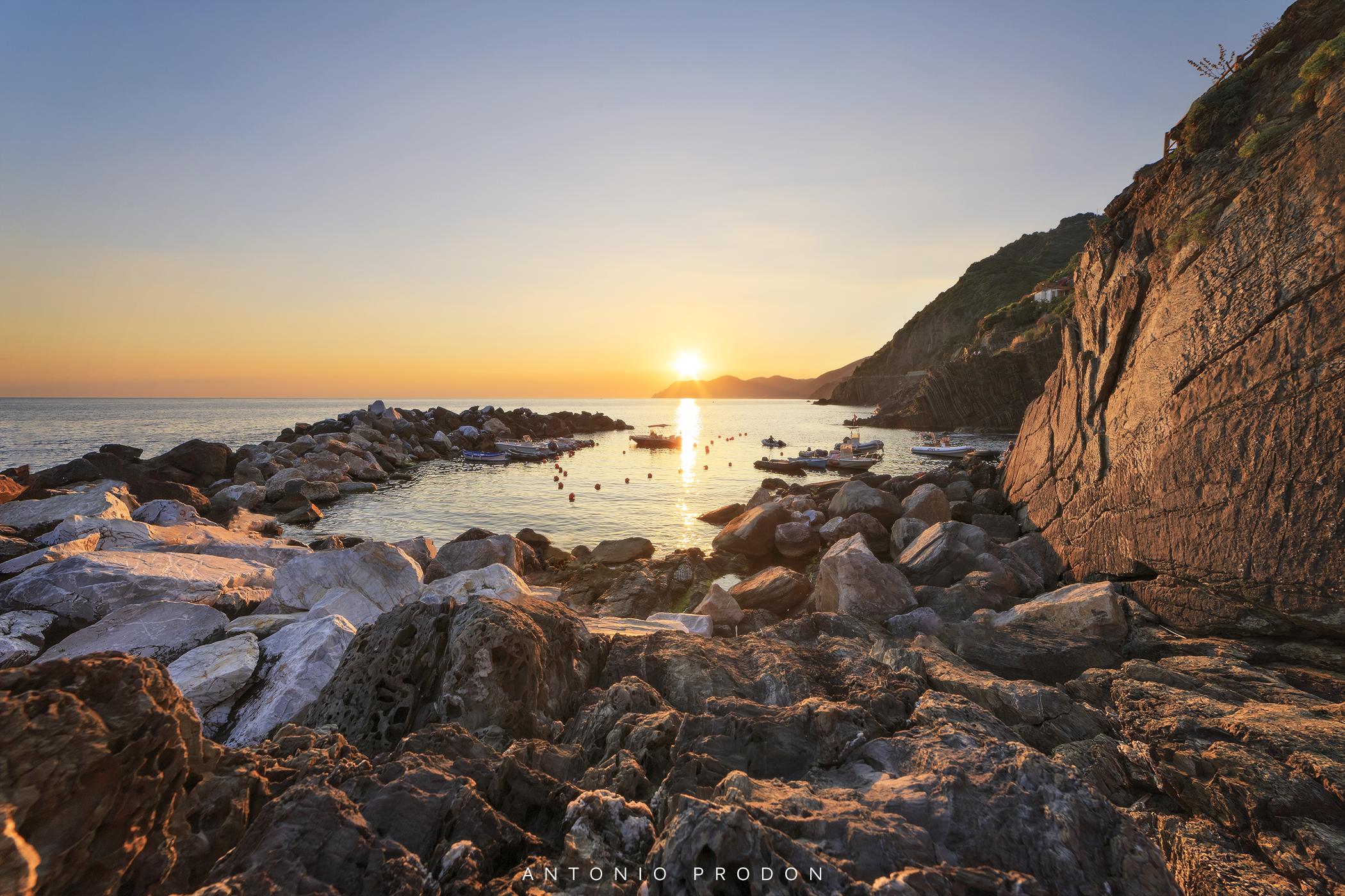 Dopo una mattinata intera al riposo in spiaggia, ci siamo mossi per poter ammirare il tramonto sul porticciolo del paesino di Riomaggiore, ed il sole ha dato spettacolo illuminando e colorando le pareti rocciose attorno a noi.