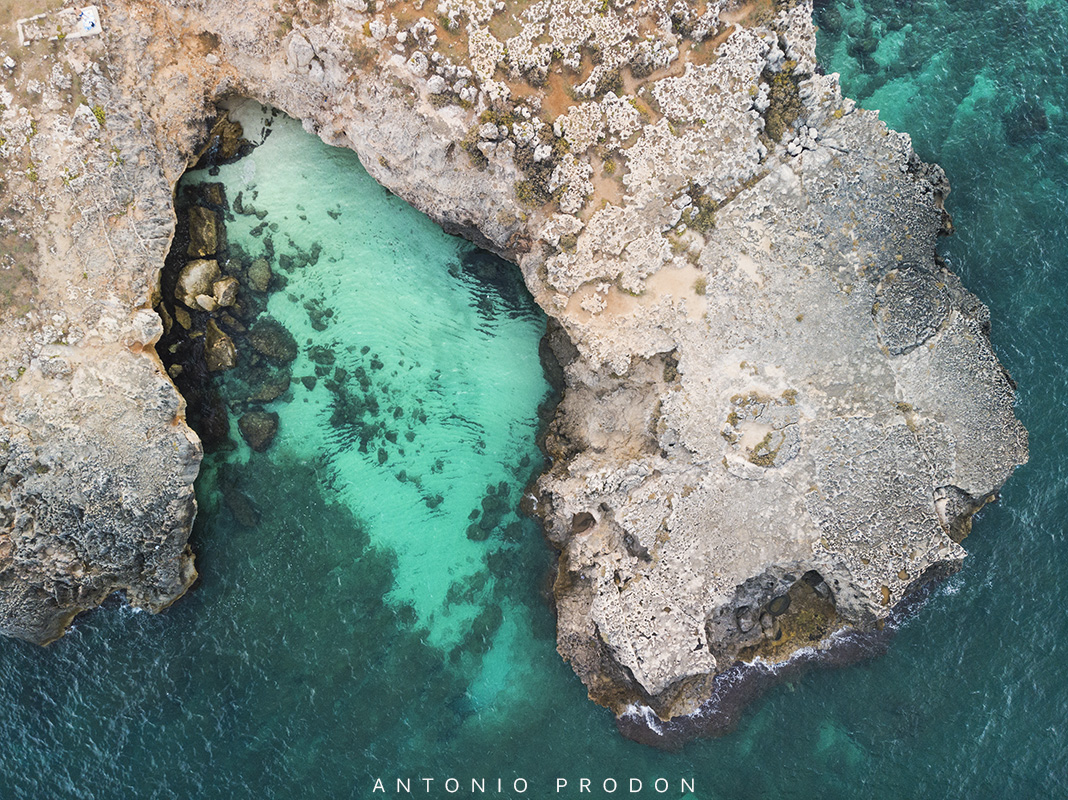 Vista dall’alto della frastagliata costa rocciosa della città di Monopoli.