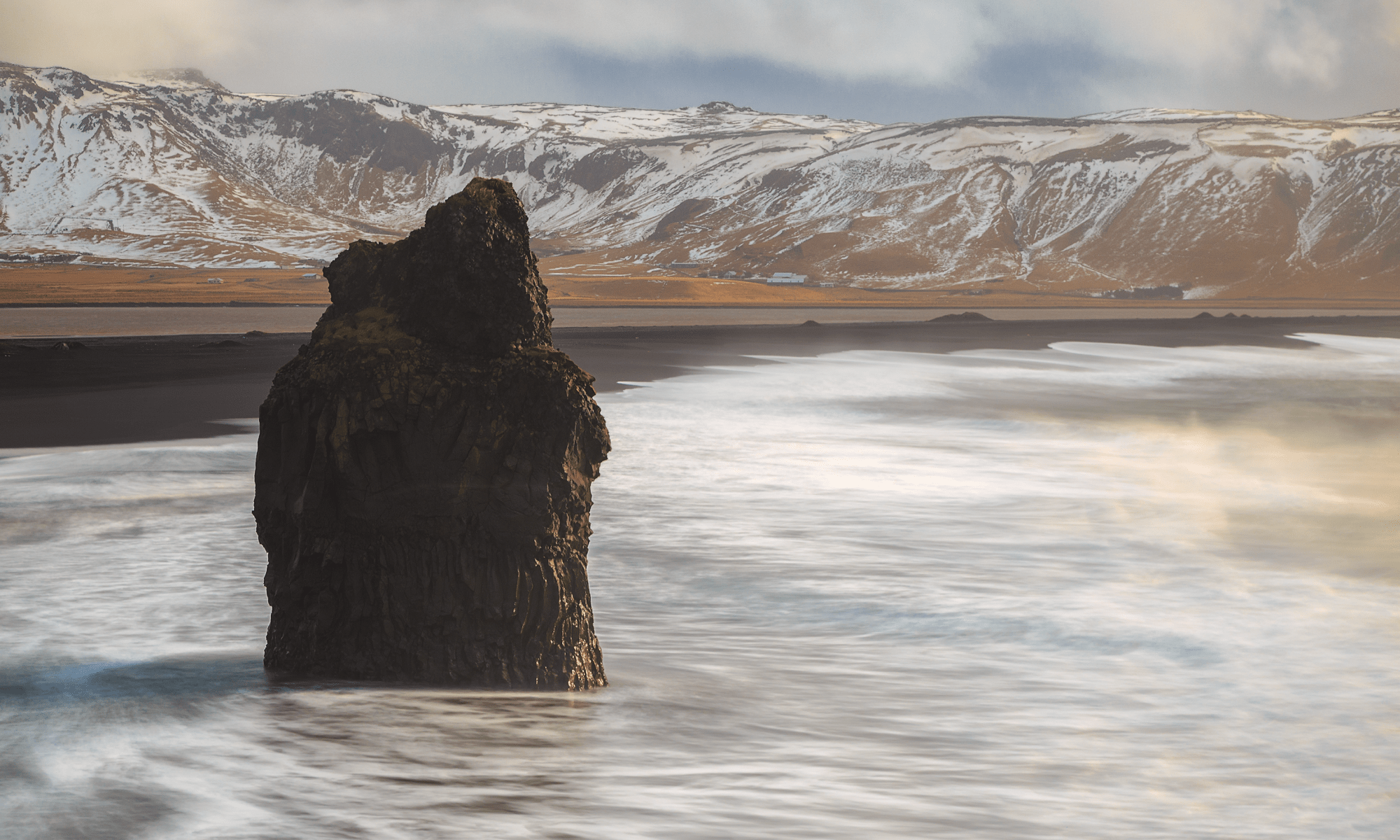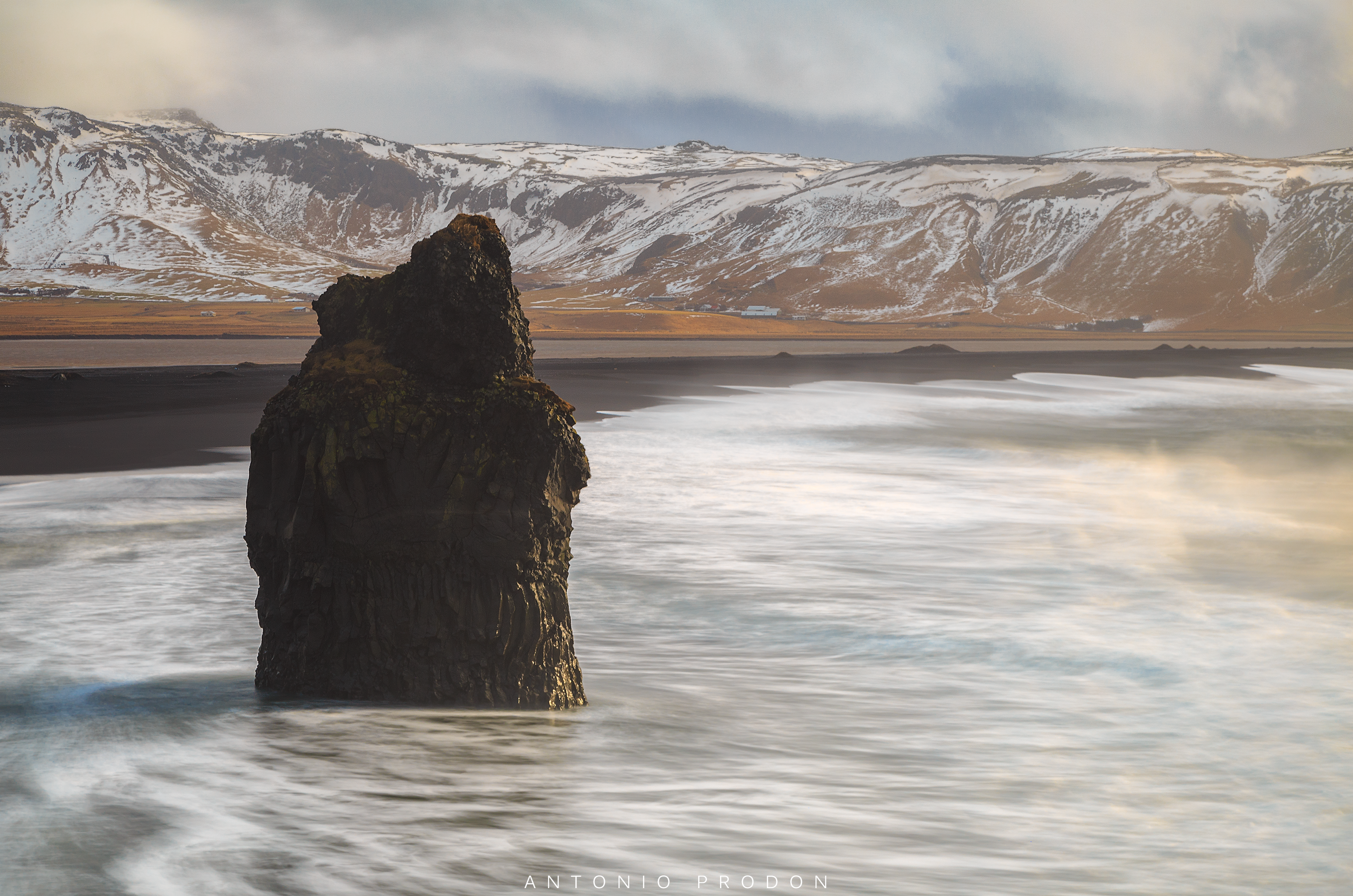 Il sole quasi sull’orizzonte ma dietro delle nuvole medio basse, riusciva a colorare le montagne di sfondo, il monolite roccioso dell’Arnardrangur e sopratutto colorava l’acqua di mare vaporizzata dalle potenti onde (visibili sul lato destro del frame) creando così una scena colorata, suggestiva e potente ai miei occhi, scena che ho voluto catturare con l’immagine pubblicata in questo articolo.